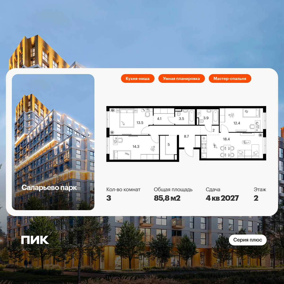 Продаются 2-к апартаменты площадью 72.7 кв.м. на 27-м этаже 33 этажного дома в ЖК "Мираполис" от ГК ОСНОВА.