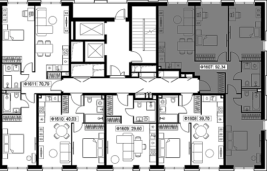 Для отделки полов во входных группах использованы мраморные плиты Terrazzo с оригинальным рисунком. Стены облицованы широкоформатным испанским керамогранитом Techlam, потолок украшает воздушная металлическая сетка. Для удобства жителей и гостей предусмотрена зона ожидания во входных группах.