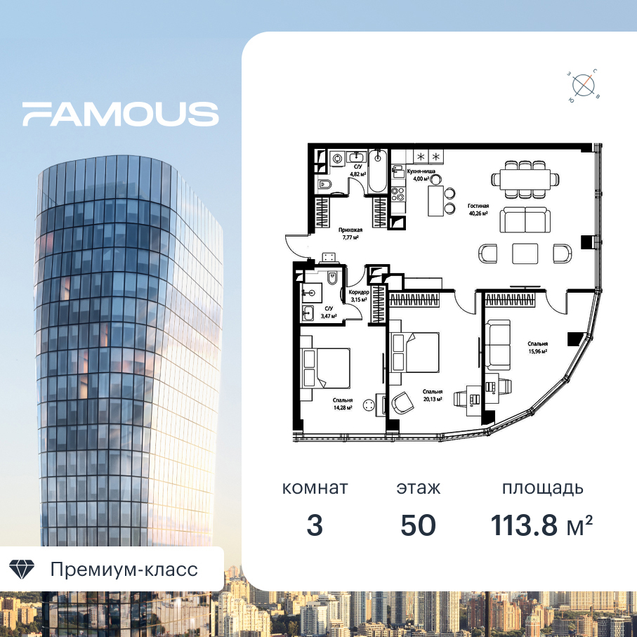 Продаётся 3-к квартира общей площадью 113.84 кв. м с предчистовой отделкой на 50-м этаже премиального небоскреба Famous.
