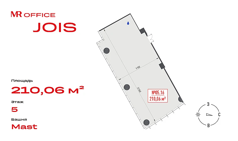 Предлагается офисное помещение 210.06 кв.м на 5 этаже БЦ Jois.