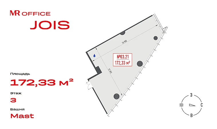 Предлагается офисное помещение 172.33 кв.м на 3 этаже БЦ Jois.