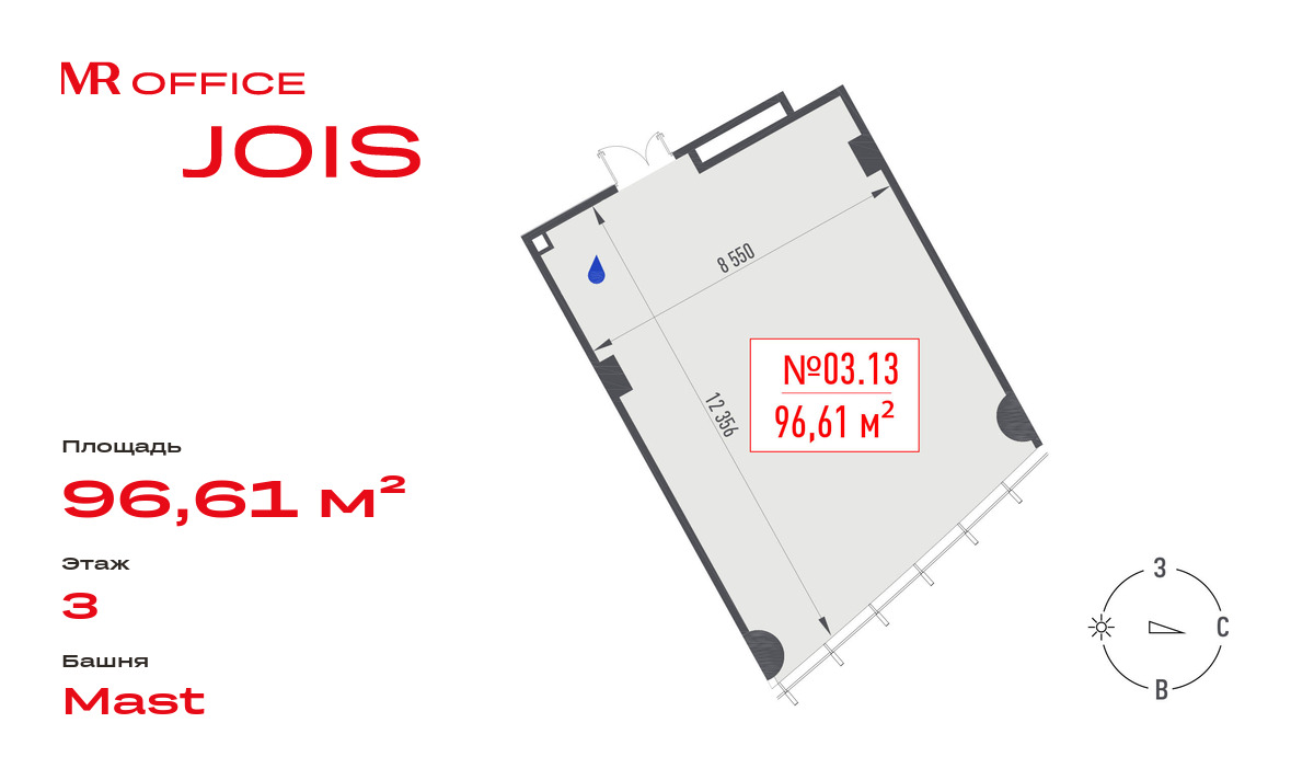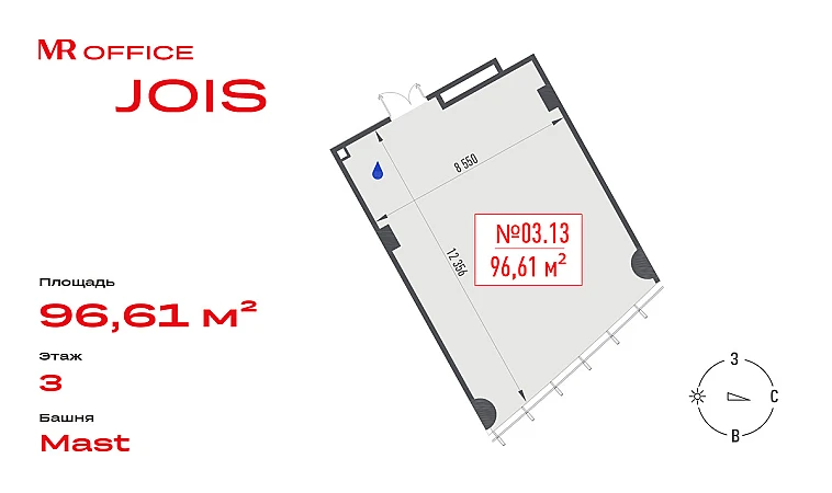 Предлагается офисное помещение 96.61 кв.м на 3 этаже БЦ Jois.
