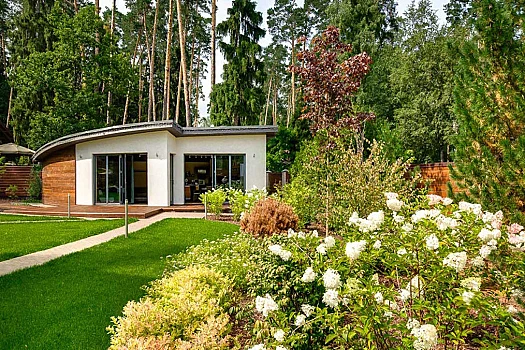 На ландшафтном участке расположена беседка-барбекю и дом для персонала.