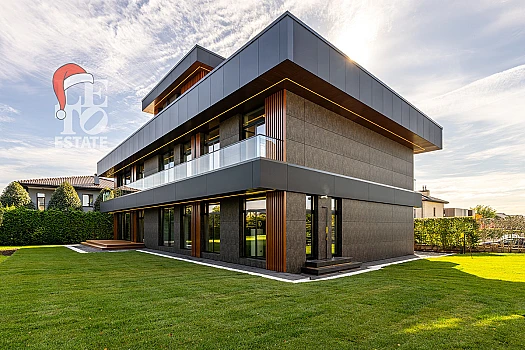 В доме 10 спален с ванными комнатами, гостиная, зал приемов, бассейн, гараж на 2 м/м с помещением для персонала на втором этаже (3 спальни). К дому примыкает дом охраны (2 спальни).