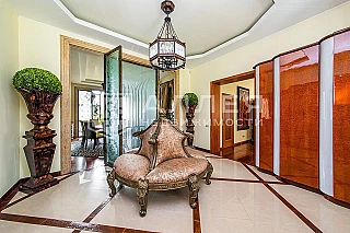 Дизайн интерьера выполнен в стиле "Ар-деко" с использованием натурального камня и ценного дерева. На полу панно из нескольких видов мрамора. Полы второго этажа из нескольких сортов массива. В парадной двухсветной гостиной установлен камин. Дом обставлен мебелью от Vissionere, установлены люстры Baroviere&Tosso. кухня от Arca. В санузлах дизайнерская сантехника.