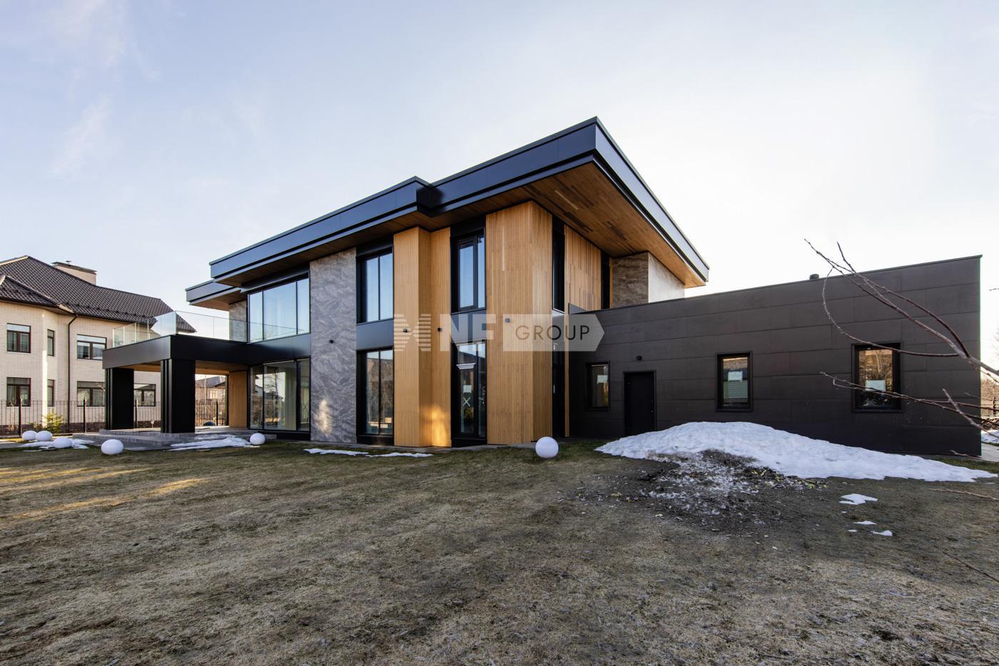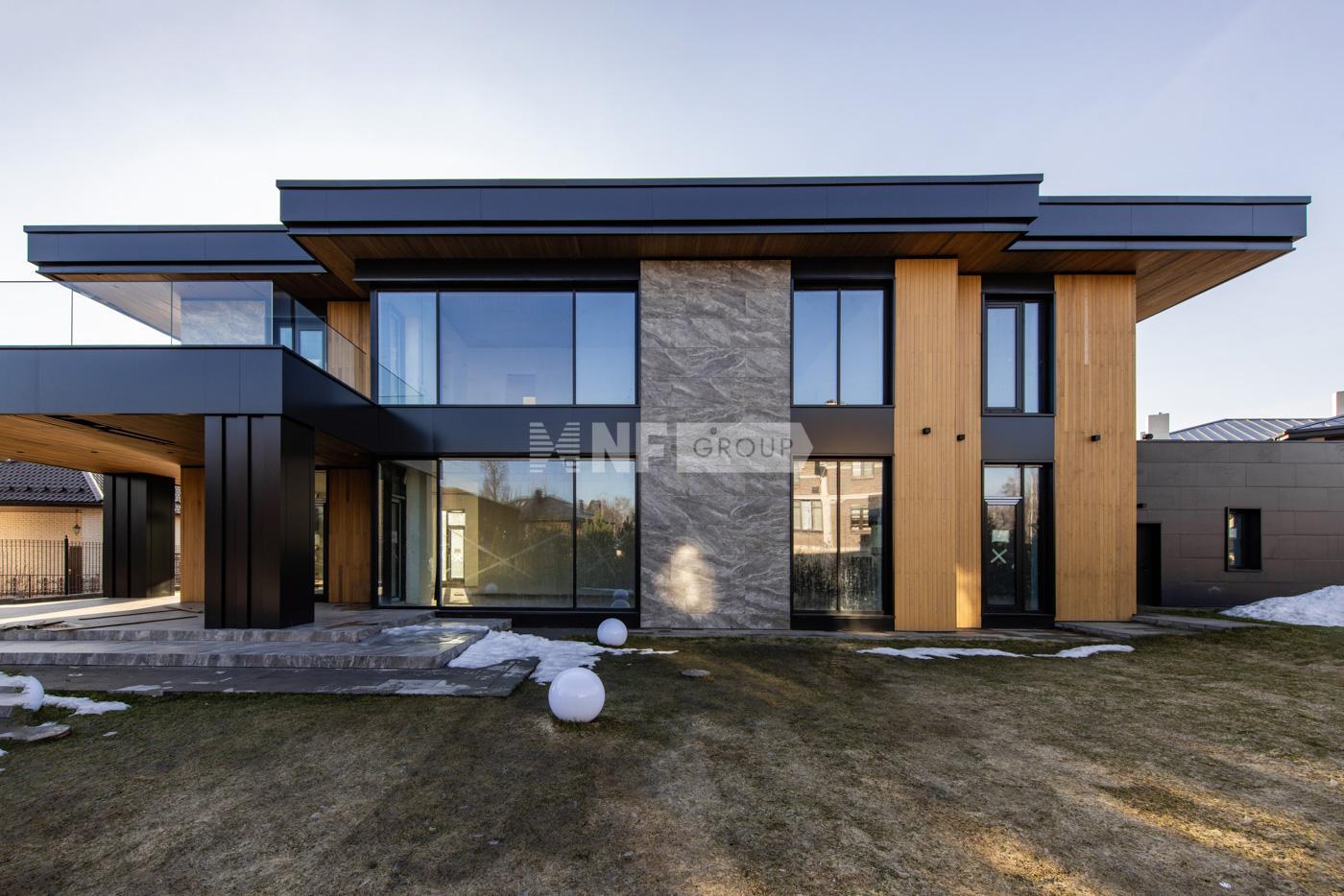 Коттедж представлен под чистовую отделку. В нём спланировали 5 спален со своими санузлами и гардеробными, гараж на 2 автомобиля, квартиру для персонала с отдельным входом, а также просторную гостиную с выходом на террасу.
