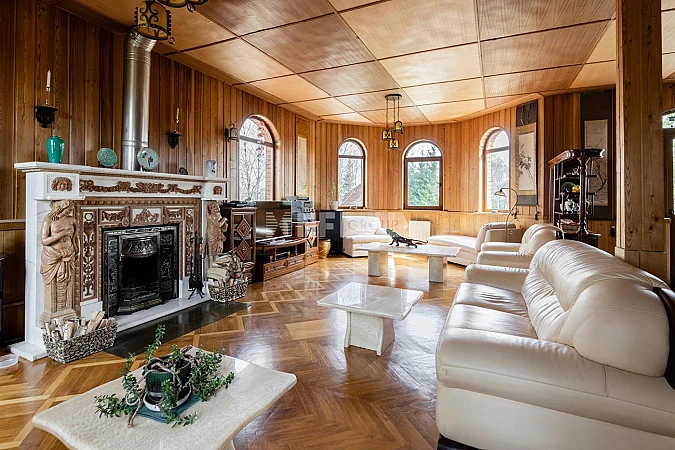 2 этаж: гостиная с функционирующим дровяным камином (с разрешением по пожарной безопасности), выход на фронтальный балкон, 2 спальни, одна с выходом на балкон на северо-западной стороне дома, совмещенный с/у с биде;