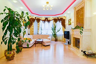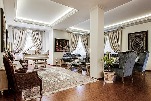 Интерьер дома выполнен в классическом стиле, в светлых тонах, меблирован, установлена сантехника, бытовая техника.