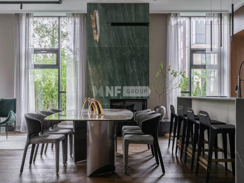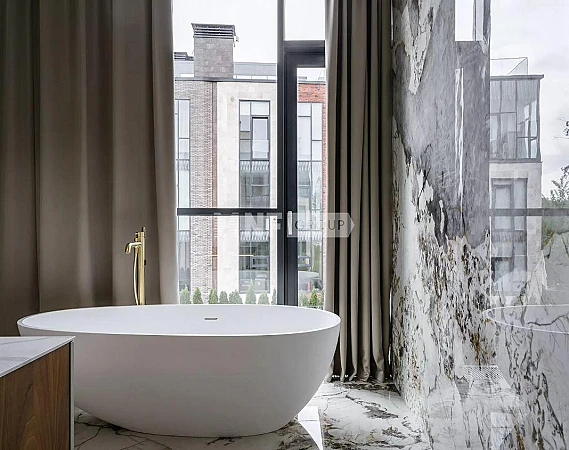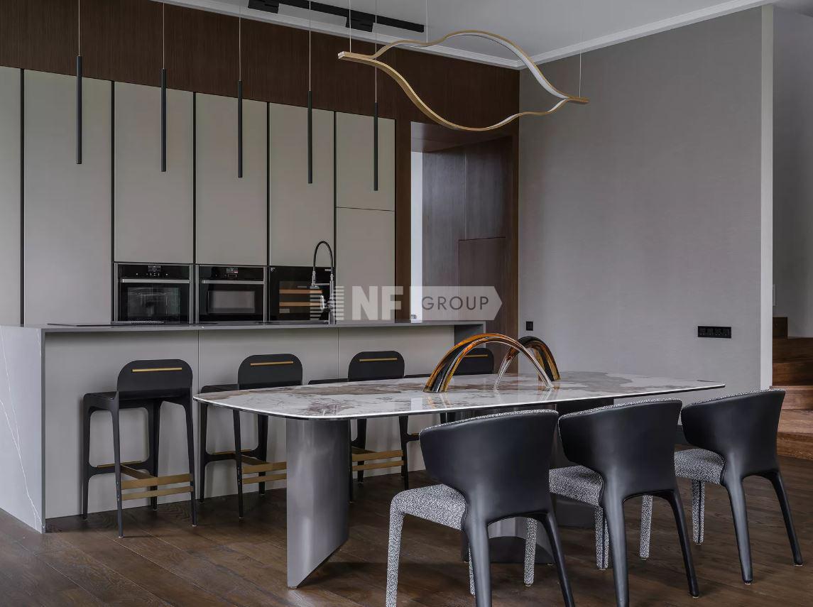 В комплектацию таунхауса входит: кухня с островом, полностью оборудованная премиальный техникой. Столешница выполнена из натурального кварца, фасады кухни эмаль, внутренняя подсветка всех шкафов, продуманные системы хранения. Смеситель фирмы Dornbracht. Индукционная плита с встроенной вытяжкой Elica NIKOLA TESLA. Встраиваемая посудомоечная машина GAGGENAU. Духовой шкаф-пароварка NEFF. Компактный духовой шкаф с СВЧ NEFF. Шкаф для вакуумирования NEFF. Шкаф для подогрева посуды AEGВстраиваемый холодильник-морозильник LIEBHERR. Постирочная: Стиральная машина MIELE. Сушильная машина MIELE. Фасады эмаль, столешница кварц, сантехника Kohler - панели в гостиной и зоне гардеробной выполнены из натурального шпона дуба- мебельные фасады всех гардеробных Cleaf, Италия, все гардеробные, постирочная и мини-кухня имеют подсветку с возможностью диммирования, кожаные корзинки, аксессуары и тд.- дизайнерская мебель и свет (Visual Comfort, Ralph Lauren, Artemest и тд., все люстры и светильники выполнены из натуральной латуни), текстильные обои (гостиная шелк-хлопок, спальни шелк, шелк-хлопок, обои из сизаля и тд), инженерная доска бренда Havwoods, подогрев пола, в отделке ванных использовался крупноформатный камень, мозаика ручной работы - премиальная сантехника Dornbracht, Kohler и тд, умный унитаз - душевые системы термостатические, инфракрасная сауна, управление отоплением предусмотрено в каждом помещении, электрические карнизы.