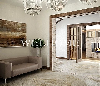 Роскошный особняк под отделку площадью 948 кв м расположен в элитном поселке на восьмом км Рублево-Успенского шоссе. Архитектурный стиль дома повторяет черты классических итальянских вилл: портики, арки, высокие окна, балконы, изящные карнизы и наличники. Фасады облицованы камнем благородного красно-коричневого оттенка, а декор выполнен в контрастном белом цвете.