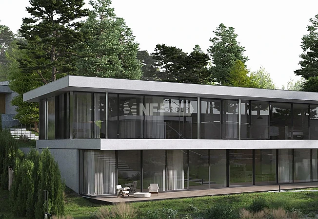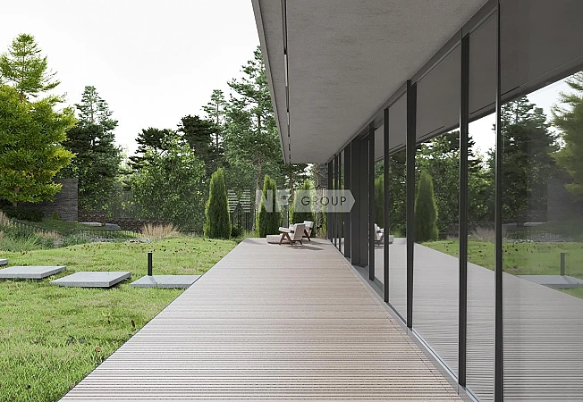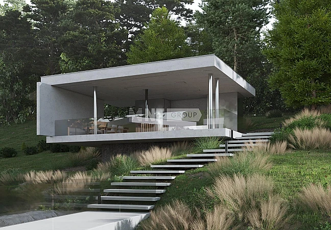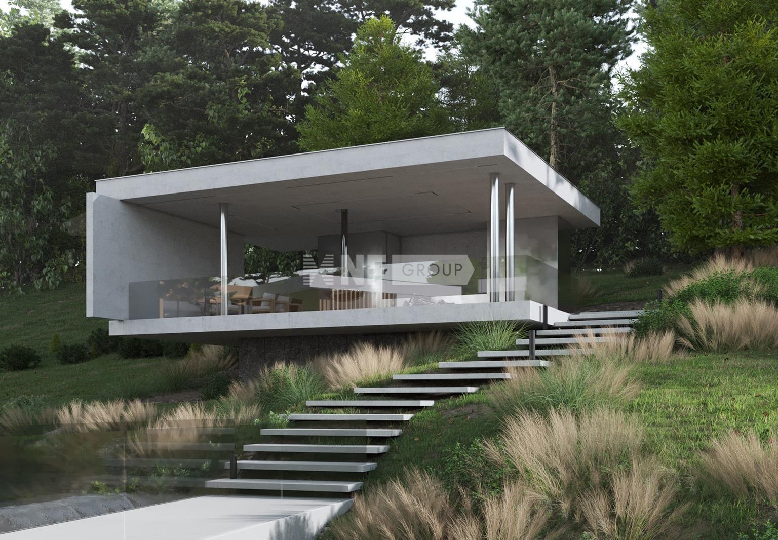 Воздушный, слегка сдержанный и «чистый» экстерьер смотрит на ручей, с другой стороны которого всю композицию уравновешивает летняя терраса-патио.