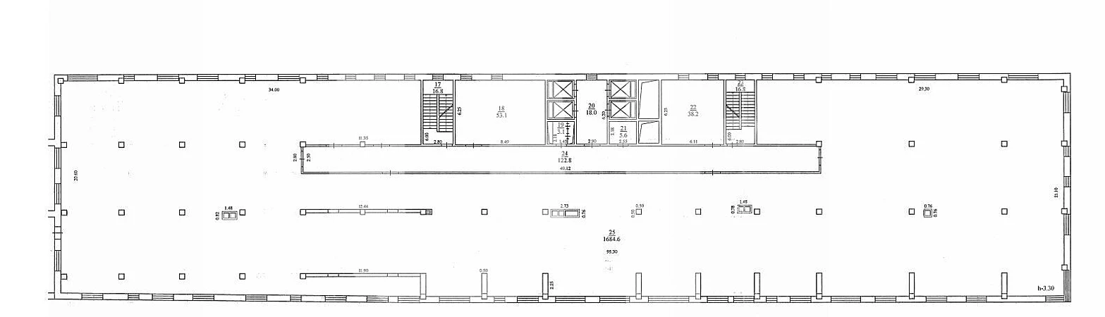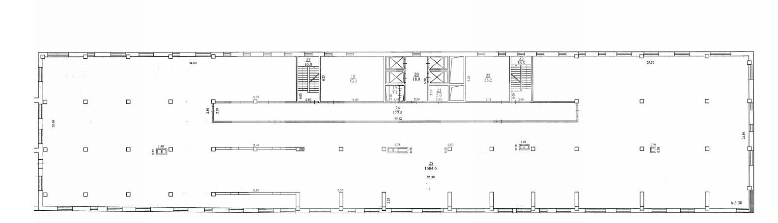 Офис расположен на этажах с высокими потолками (3.6 м от пола до пола) и полезной нагрузкой 400 кг/м². Каждый этаж представляет собой единое пространство площадью 1959 м², что позволяет реализовать любую планировку. Инфраструктура здания включает помещение общественного питания на 50 мест.