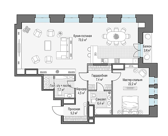 Просторная квартира площадью 127,2 кв. м. с видом в итальянский сад и на исторические павильоны 19 века. Высота потолка 3,9 метра. В кухне-гостиной расположены 3 окна и балкон, что делают комнату светлой и просторной. Продуманная планировка позволяет разместить две приватные спальные комнаты с отдельными гардеробными и санузлами. Окна квартиры выходят на две стороны.