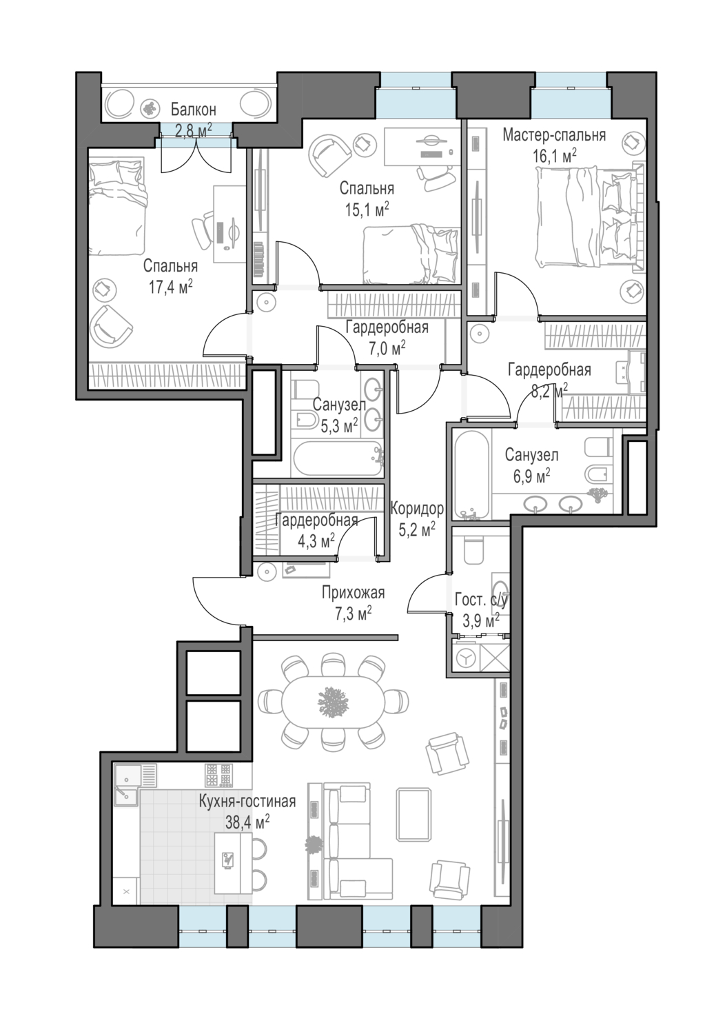 Просторная светлая квартира площадью 136,8 кв. м. с высотой потолка 3,9 метра. Из кухни-гостиной открываются виды в приватный итальянский сад и фонтаны. А из спален виден тихий московский дворик. Продуманное планировочное решение позволяет разместить спальни на одной стороне квартиры, а кухню-гостиную на противоположной, разделив зоны на приватные и общественные.