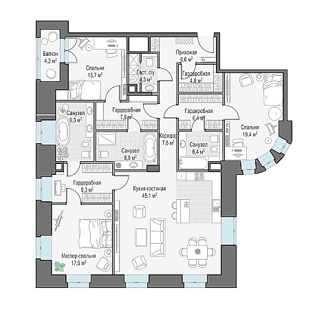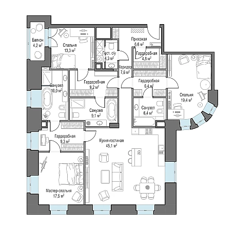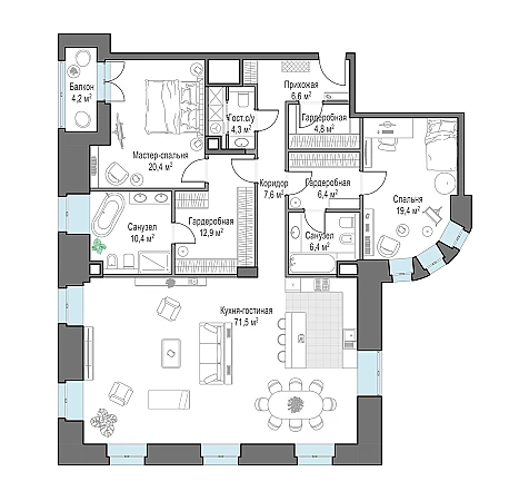 Просторная светлая квартира площадью 171,1 кв. м. с арочными окнами на три стороны света и французскими балконами, создающие атмосферу исторической Москвы прошлого века. Роскошная кухня-гостиная с видом в итальянский сад и на фонтаны, а также в тихий московский дворик. Продуманная планировка позволяет разместить три спальные комнаты с отдельными санузлами и гардеробными. В ванной и гардеробной, примыкающим к мастер-спальне, предусмотрены панорамные окна, визуально увеличивающие площадь комнат.