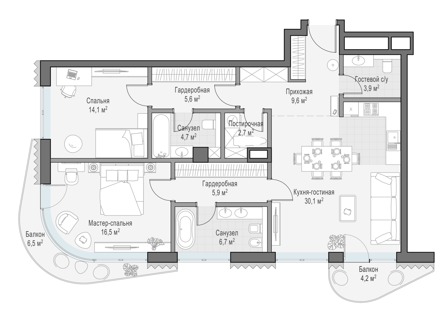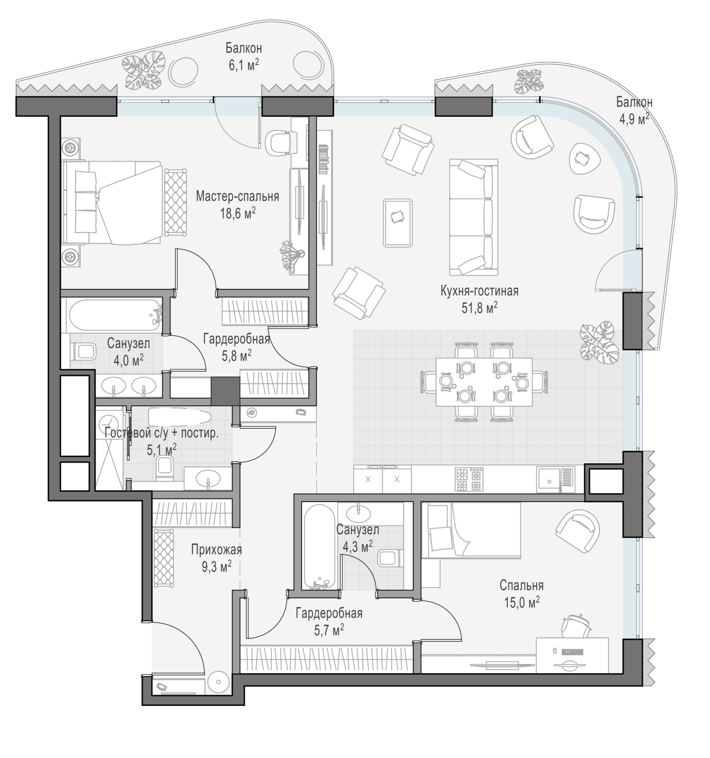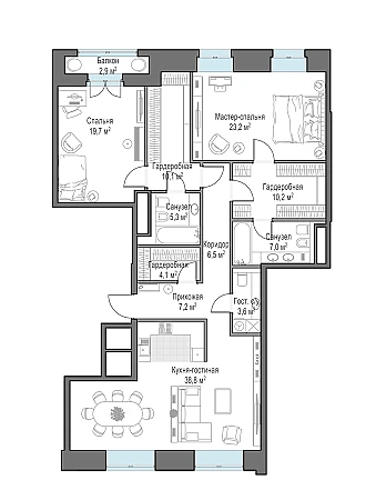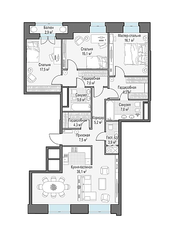Просторная светлая квартира площадью 137,1 кв. м. с арочными окнами на две стороны света и французскими балконами, создающие атмосферу исторической Москвы прошлого века. Окна кухни-гостиной смотрят в итальянский сад и фонтаны. Продуманная планировка позволяет разместить три спальные комнаты с отдельными санузлами и гардеробными. К одной из спален примыкает просторный балкон, на котором приятно провести время в любое время суток.
