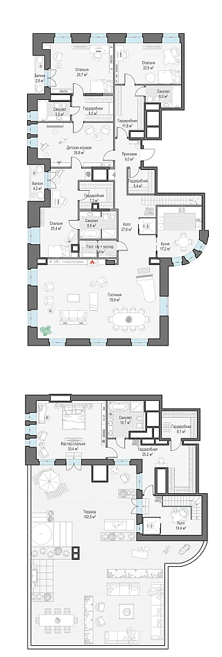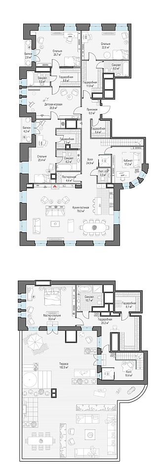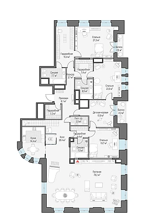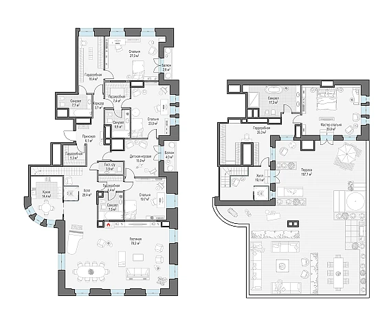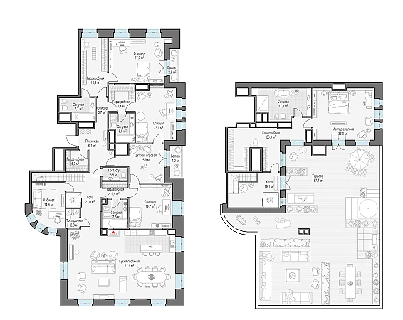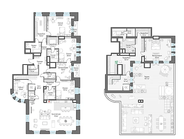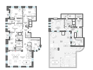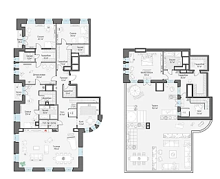 В пентхаусе общей площадью 373 кв. м, расположенном на 6-м этаже, чётко разделены приватная и гостевая зоны, их окна и балконы выходят на 4 стороны света. Арочные окна, элегантный сферический эркер и высокие 4-метровые потолки создают пространство, наполненное светом. Два балкона — и полный простор для фантазии! Дровяной камин в кухне-гостиной создаст уютную и во всех смыслах тёплую атмосферу зимним вечером. Расположенная на крыше личная терраса площадью 188 кв. м с неповторимыми видами на исторический центр столицы подчеркнёт высокий статус владельцев.