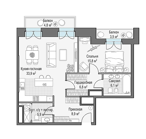 Уютная односпальная квартира с двумя балконами и панорамными окнами площадью 80,9 кв.м. Из окон открывается вид в красивый приватный сад и тихий московский дворик. Высота потолка 3,9 м.