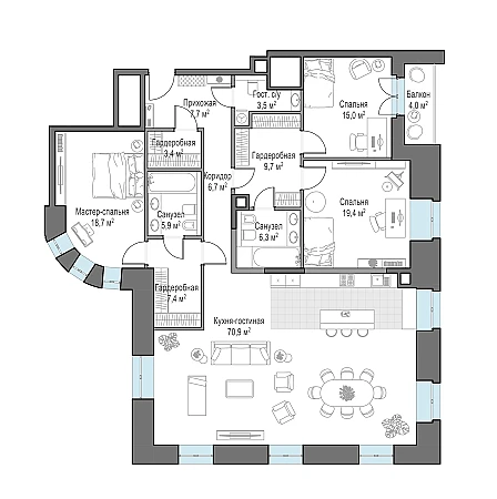Светлая квартира площадью 176,7 кв. м. с высотой потолка 3,9 метра. Роскошная кухня-гостиная с видом на три стороны дарит пространству много света. Из окон кухни-гостиной открываются виды в итальянский приватный сад, тихий московский дворик и на исторические павильоны 19 века. Элегантный сферический эркер добавит кабинету или спальне уюта и изысканности.
