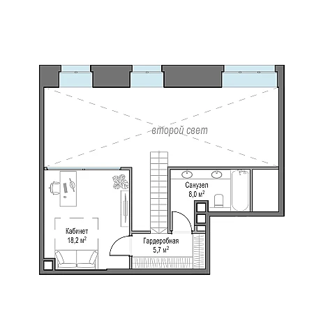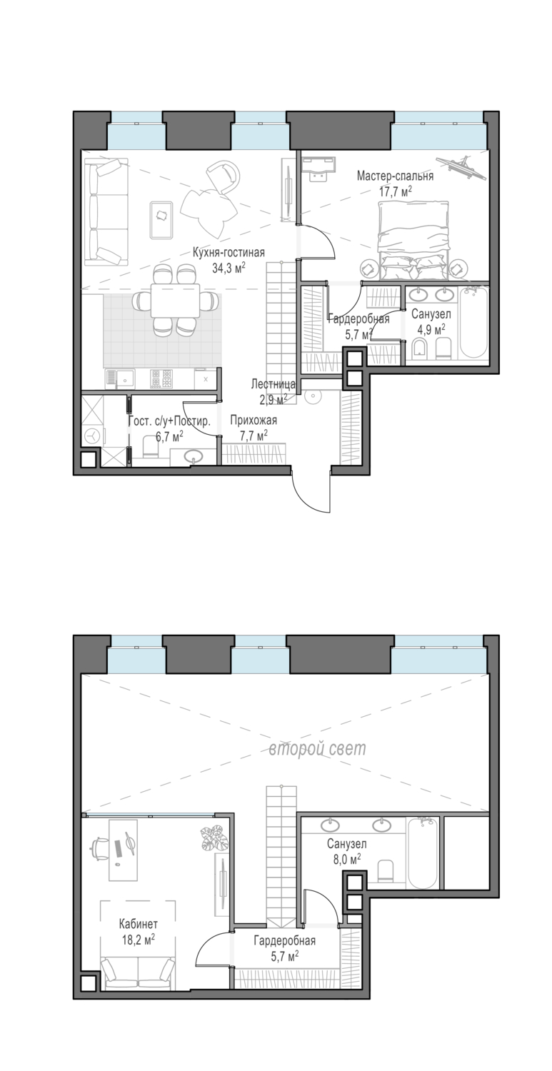 Уютная светлая квартира площадью 79,5 кв. м с видом в тихий итальянский сад. Высота потолка 5,4 метра позволят разместить дополнительную мастер-спальню на втором этаже. Помимо высоких потолков в квартире предусмотрены высокие окна 3,3 метра.