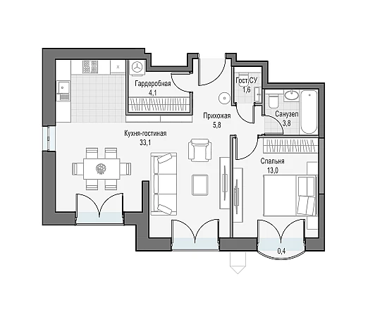 Двуспальная квартира с кухней-гостинной. Четыре окна и три балкона. Окна Выходят на Восток в сторону панорамы города.