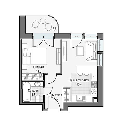 Односпальная квартира с угловым остеклением и большим балконом. Окна выходят на Восток в сторону парка.
