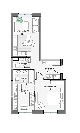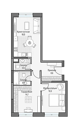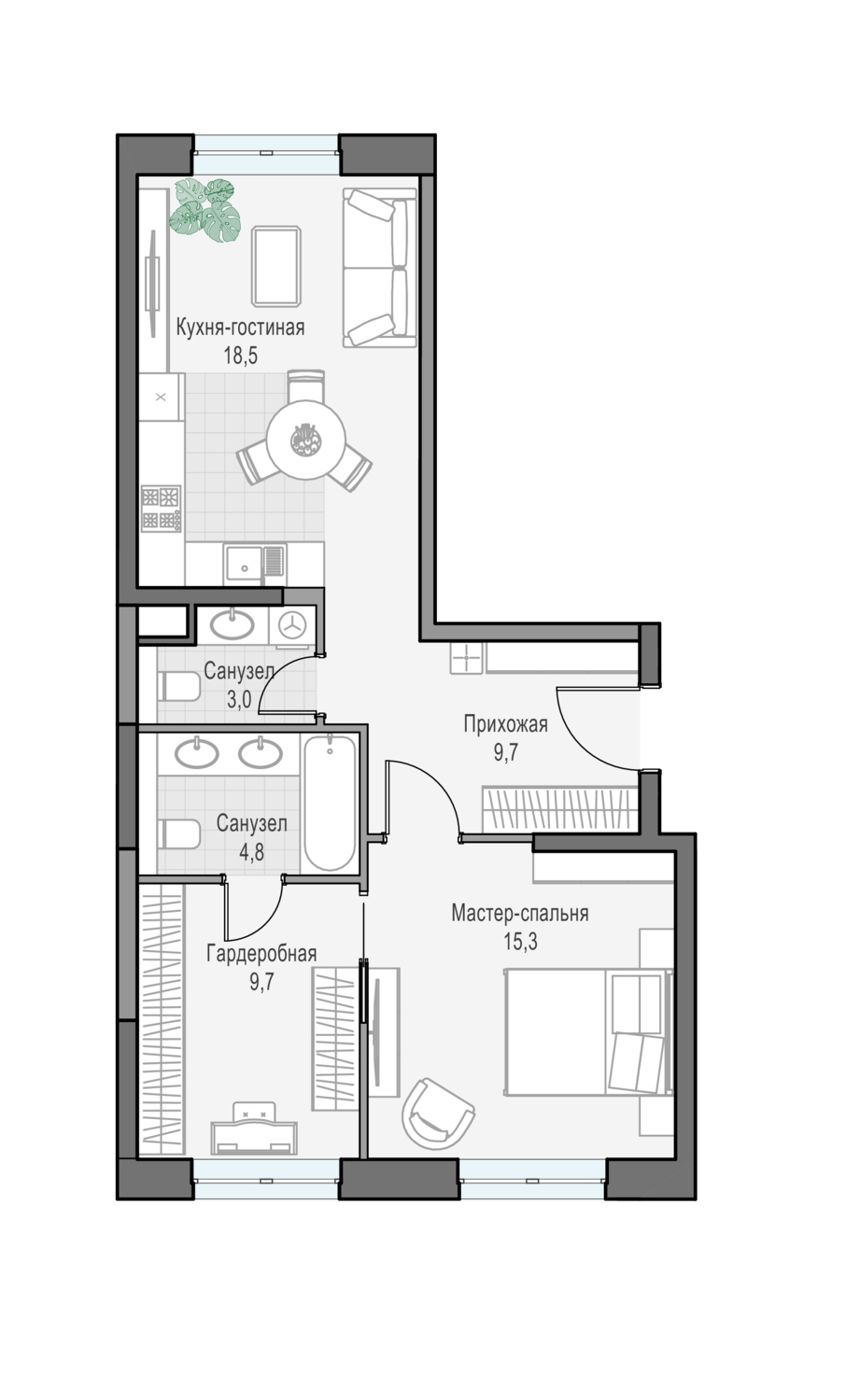 Двуспальная квартира с кухней-гостиной и окнами на 2 стороны света. Окна выходят на Запад и Восток, во двор и пеший променад.
