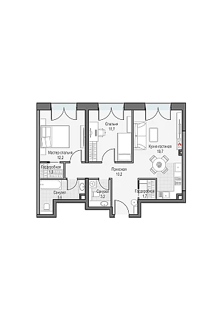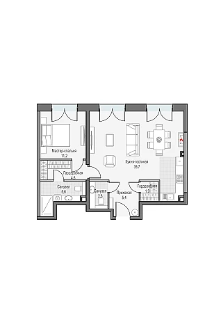 Двуспальная квартира с кухней-гостиной и настоящим дровянным камином, мастер-спальней с собственной гардеробной и сан.узлом 5.6м2. Все окна в квартире с панорамным остекленим с французким балконом. Мы предусмотрели гардеробную при входе и гостевой сан.узел.