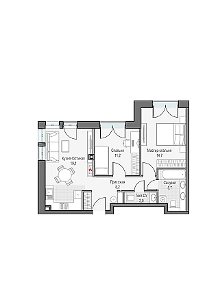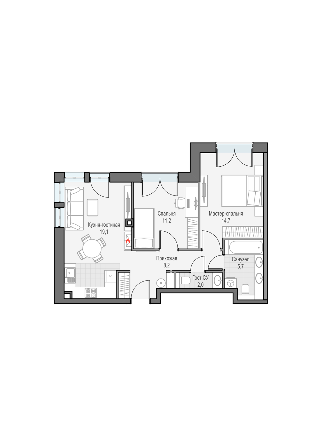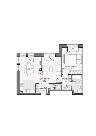 Двуспальная квартира с кухней-гостиной и настоящим дровяным камином, мастер-спальней с собственной гардеробной и сан. узлом 5.6м2. Окна выходят на Восток с видом на парк "Дубовая роща" и телебашню "Останкино"