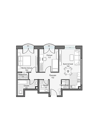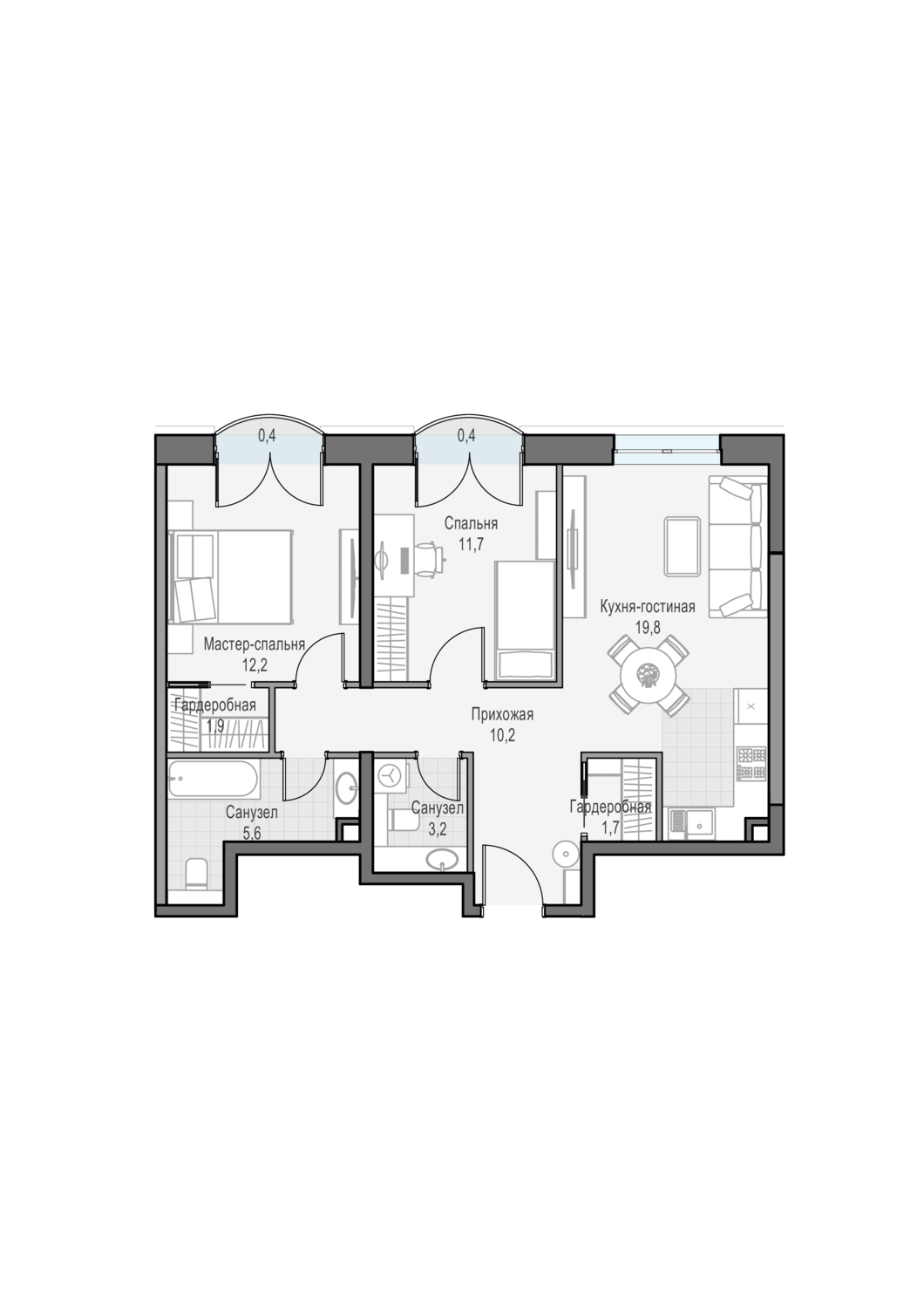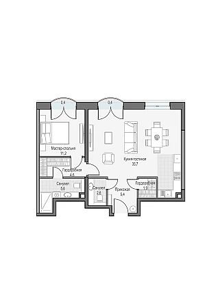 Двуспальная квартира с кухней-гостиной, мастер-спальней с собственной гардеробной и сан. узлом 5.6м2. Окна выходят на Восток с видом на парк "Дубовая роща" и телебашню "Останкино"