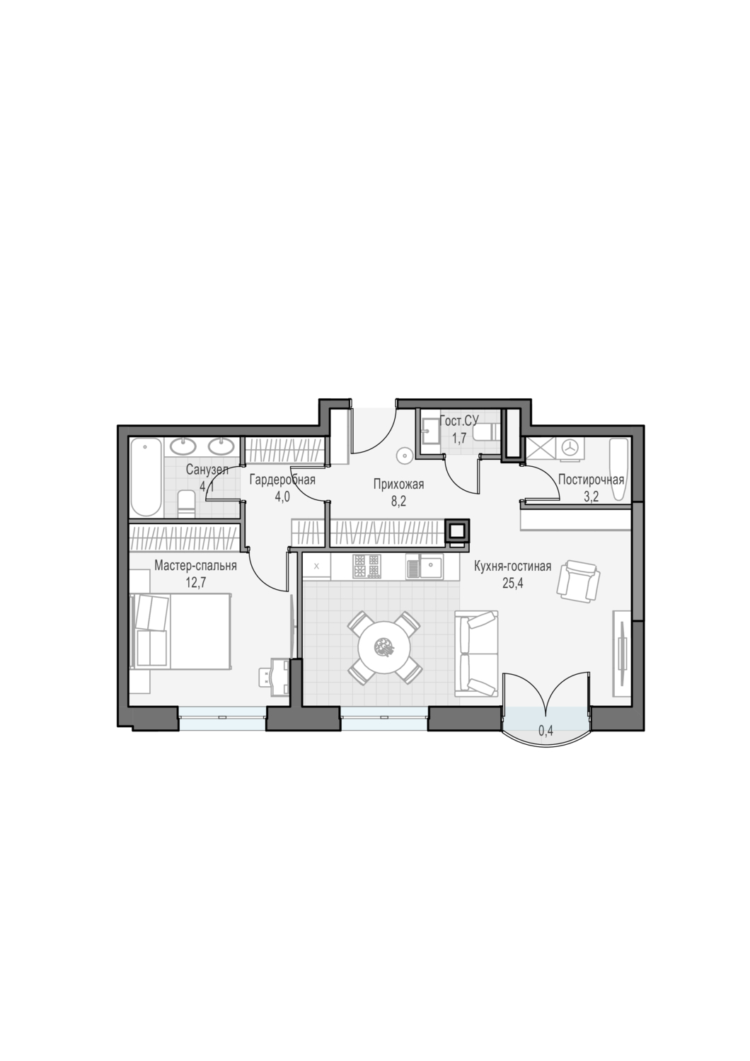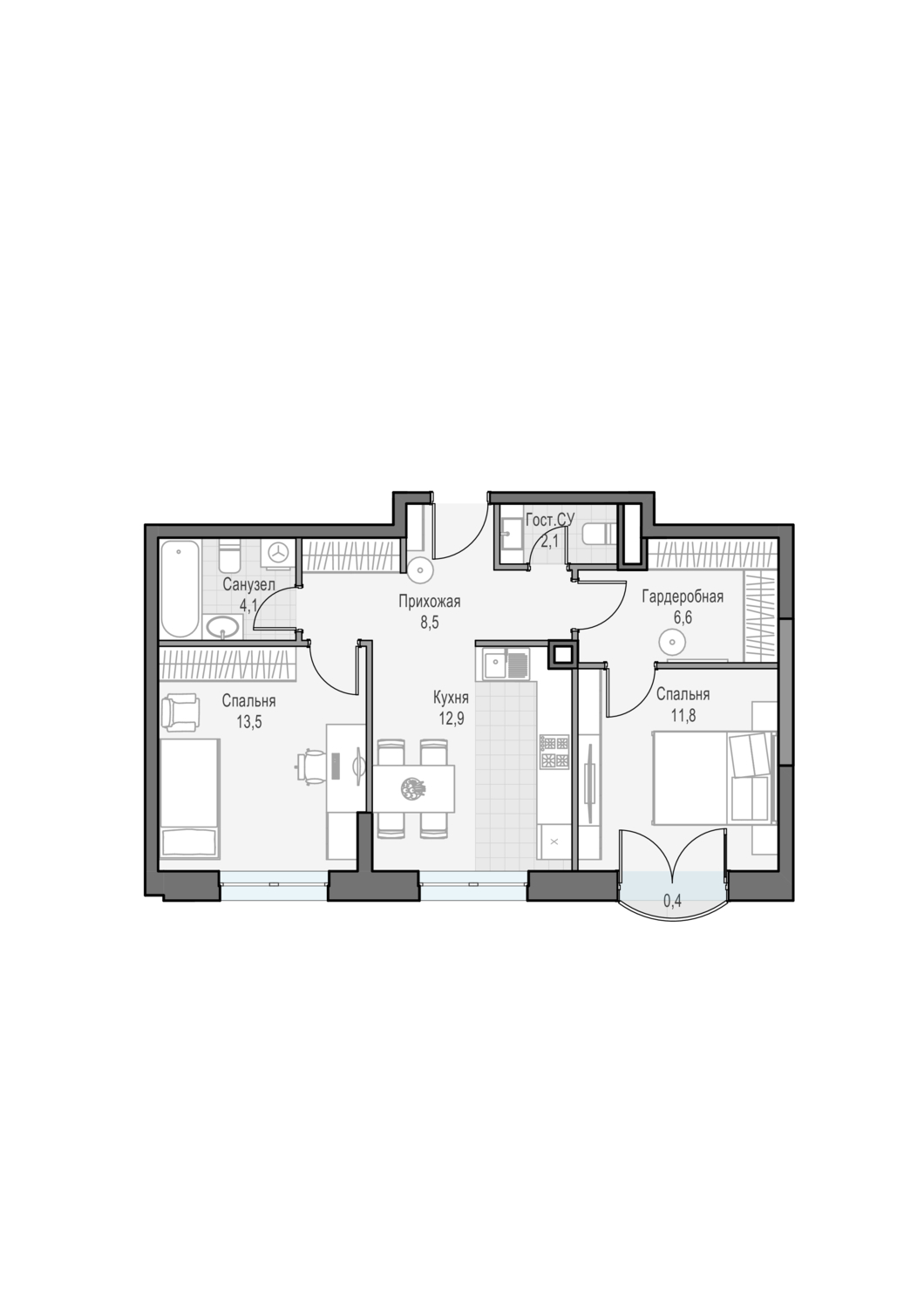 Двуспальная квартира с кухней в центре и двумя спальнями. Мастер-спальня с гардеробной и балконом. . Окна выходят на Восток с видом на панораму города.