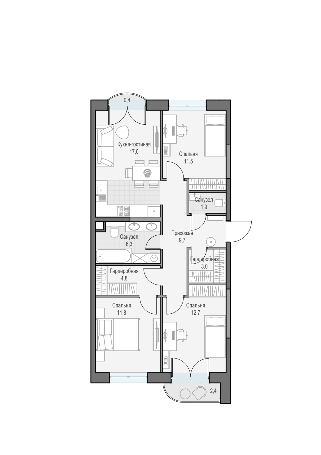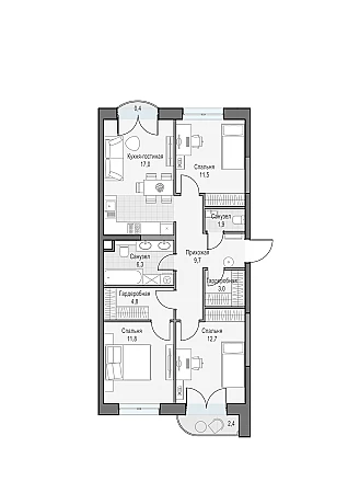 Трехспальная квартира на две стороны света. Из окон открывается вид на парк Дубовая Роща и Останкинскую телебашню. Окна двух спален выходят с видом на двор-долину.