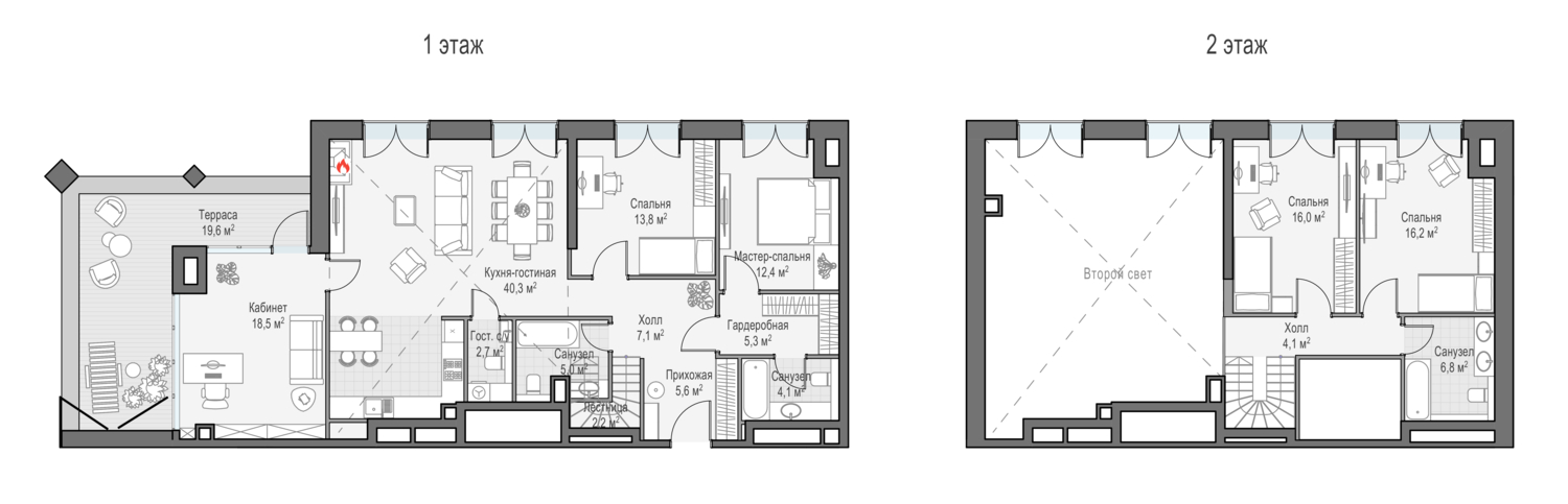 Двухэтажный Penthouse с террасой 20,6 кв.м и дровяным камином в кухне-гостиной. Высота потолка - 6,5 м. В комантах французские балконы. Окна выходят на Восток.