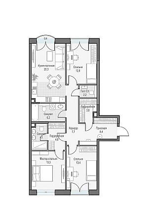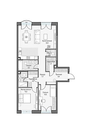 Просторная трехспальная квартира с окнами на две стороны света. Из мастер-спальни в вечернее время вы сможете наслаждаться закатом и панорамой города.