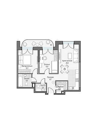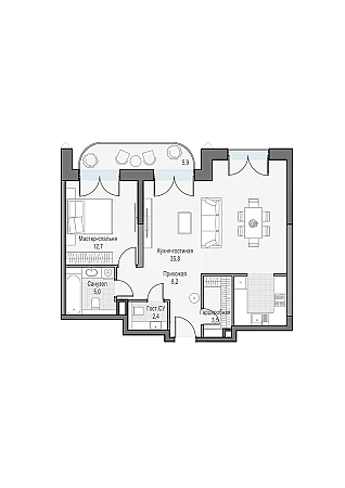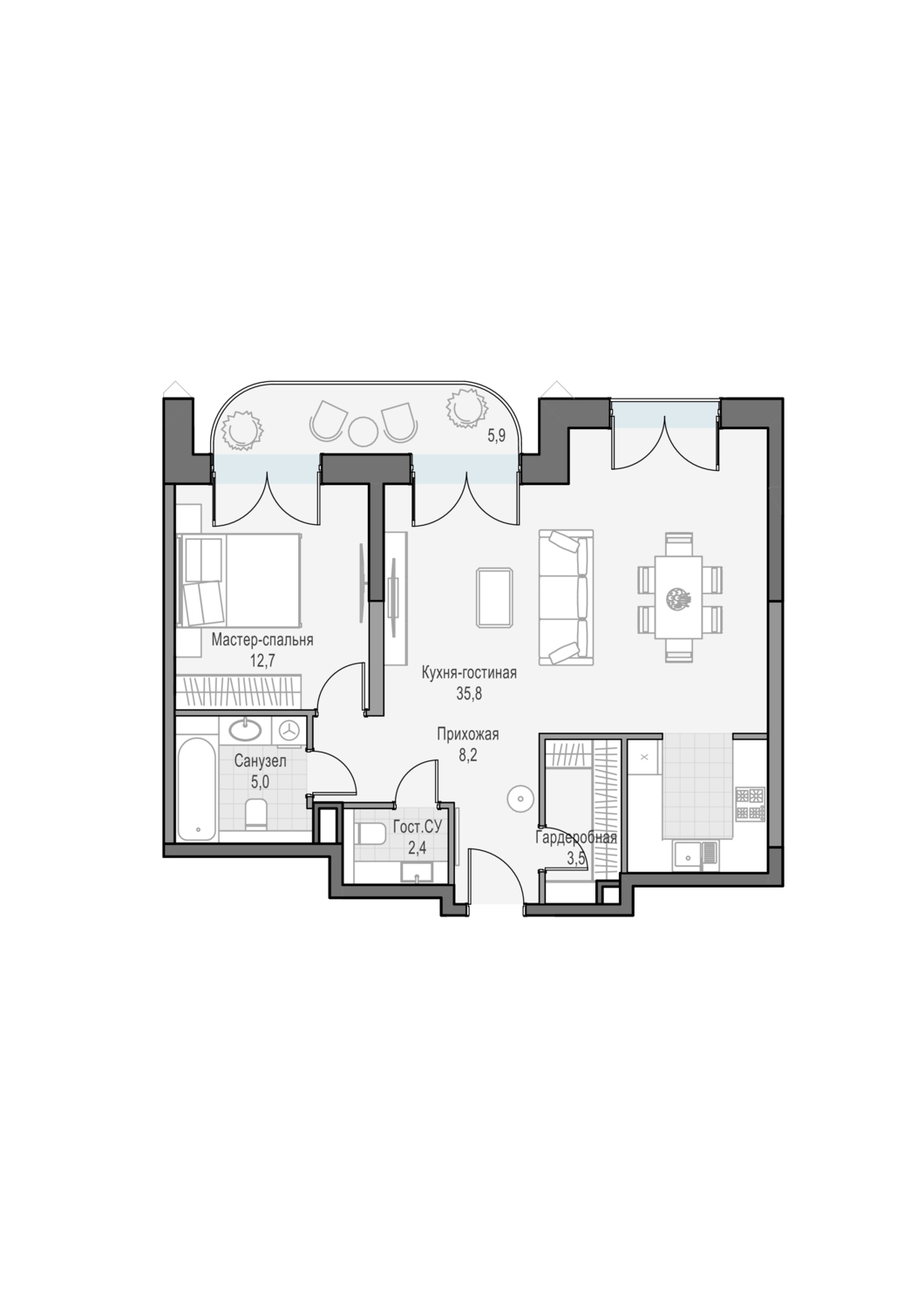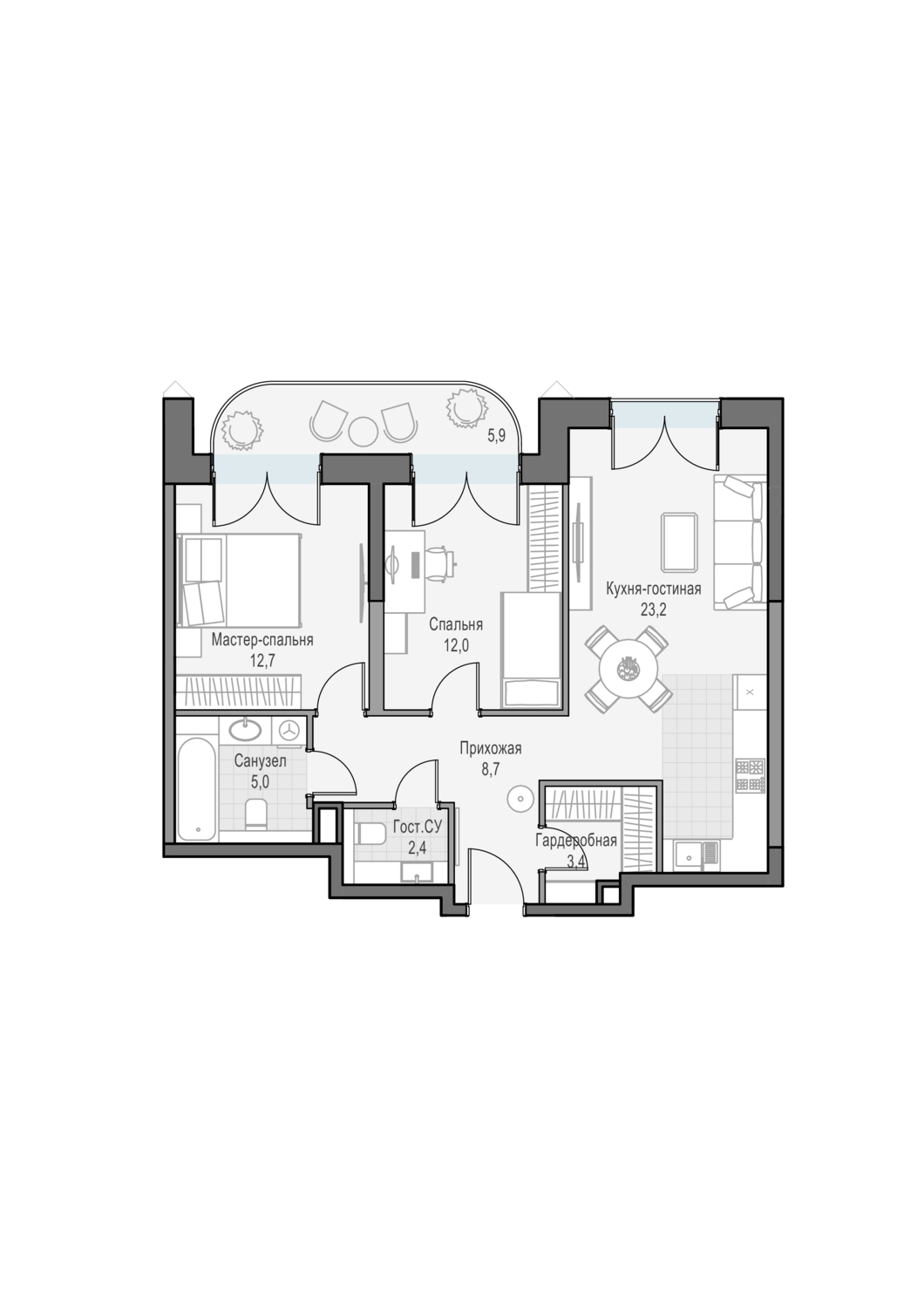 Просторная двуспальная квартира с кухней-гостиной. Окна выходят на Восток, что позволяет наслаждаться по утрам восходом солнца.