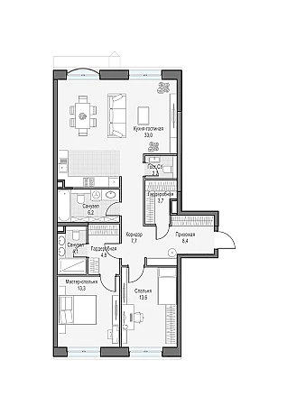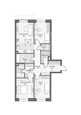 Просторная трехспальная квартира с окнами на две стороны света. Из мастер-спальни в вечернее время вы сможете наслаждаться закатом и панорамой города.
