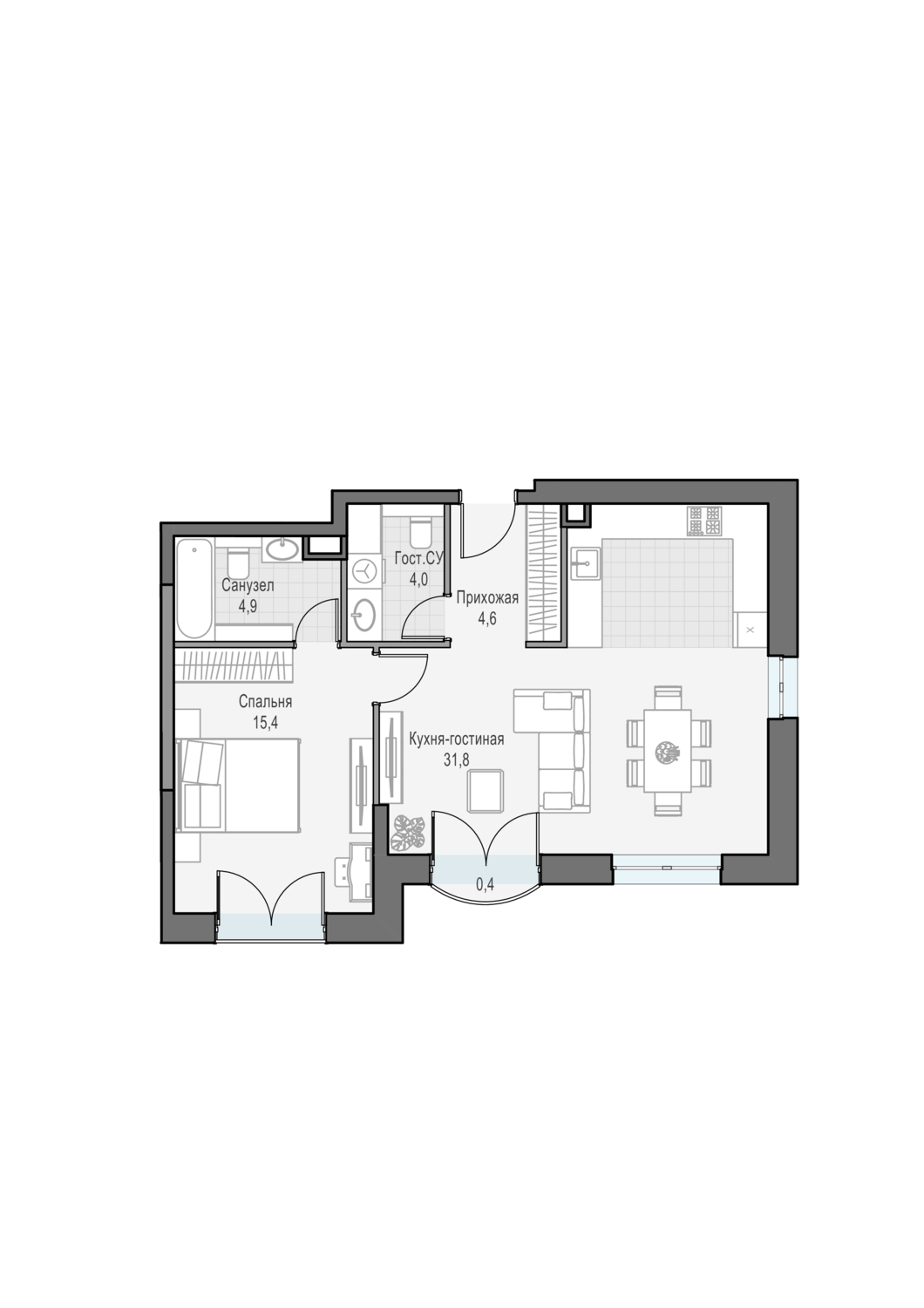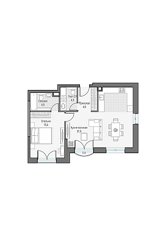 Двуспальная квартира с угловым остеклением в кухне-гостиной и панорамными окнами в спальнях. Виды позволят наслаждаться закатом и любоваться огнями ночного города.