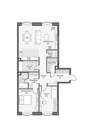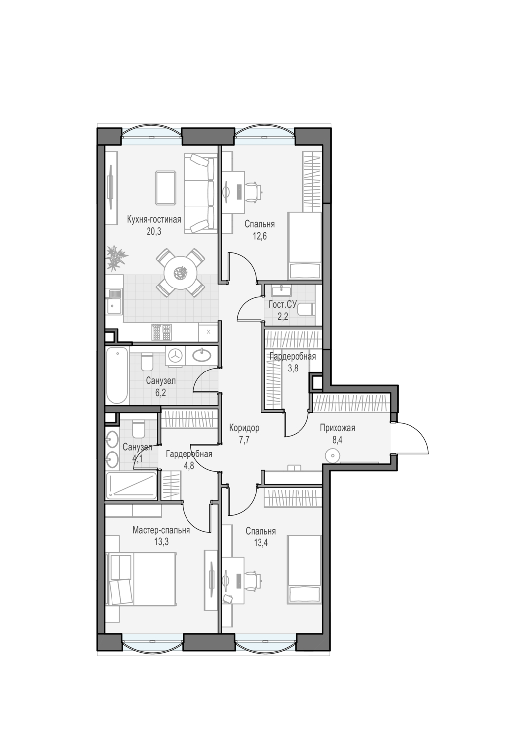 Просторная трехспальная квартира с окнами на две стороны света. Из мастер-спальни в вечернее время вы сможете наслаждаться закатом и панорамой города.