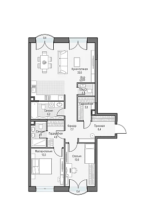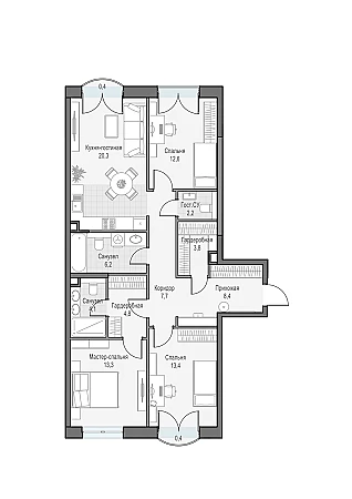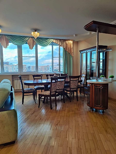Просторная трехспальная квартира с окнами на две стороны света. Из мастер-спальни в вечернее время вы сможете наслаждаться закатом и панорамой города.