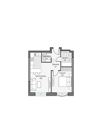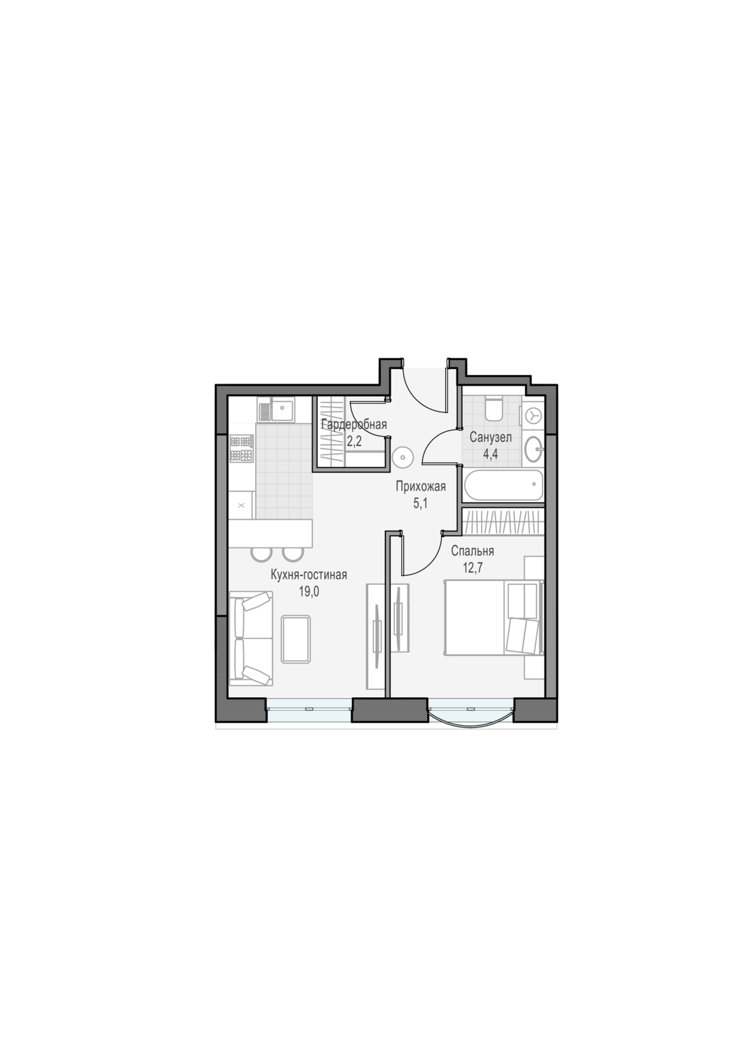 Просторная односпальная квартира с кухней-гостиной и гардеробной. Окна выходят на Запад, откуда открываются виды на закат.