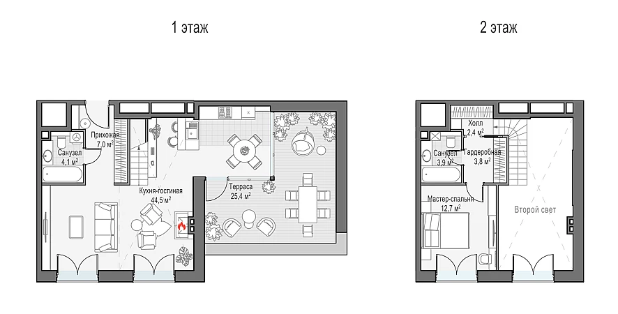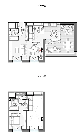 Двухуровневый пентхаус с просторной террасой 25,4 м. Высота потолка - 6,5 м. В кухне-гостиной дровяной камин и два французских балкона. Окна выходят на Запад, что позволит любоваться закатами и панорамой города.