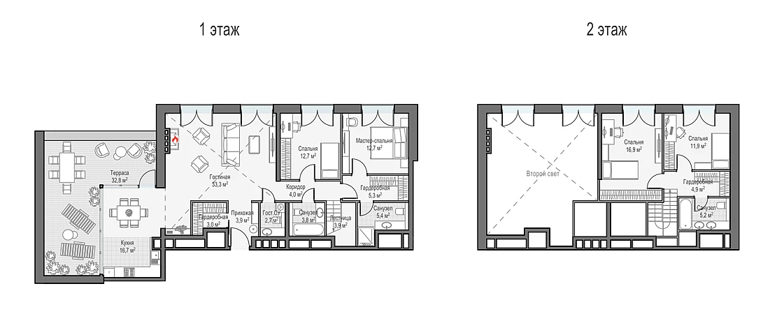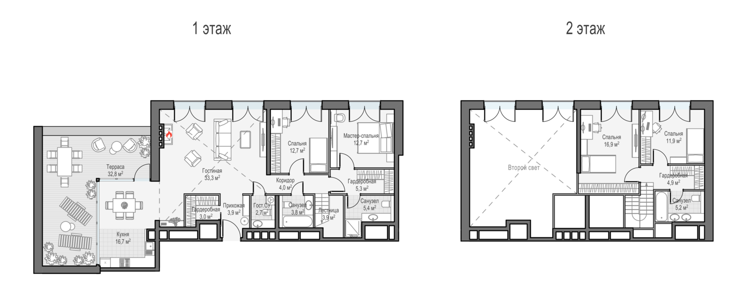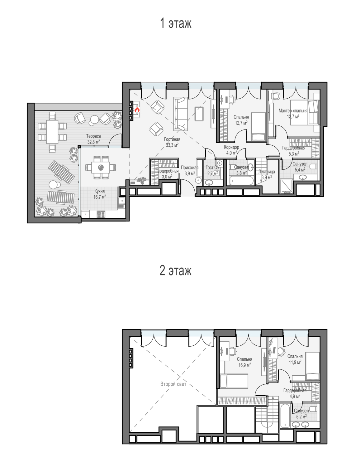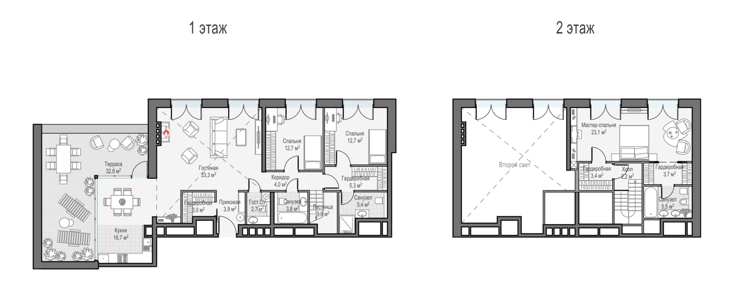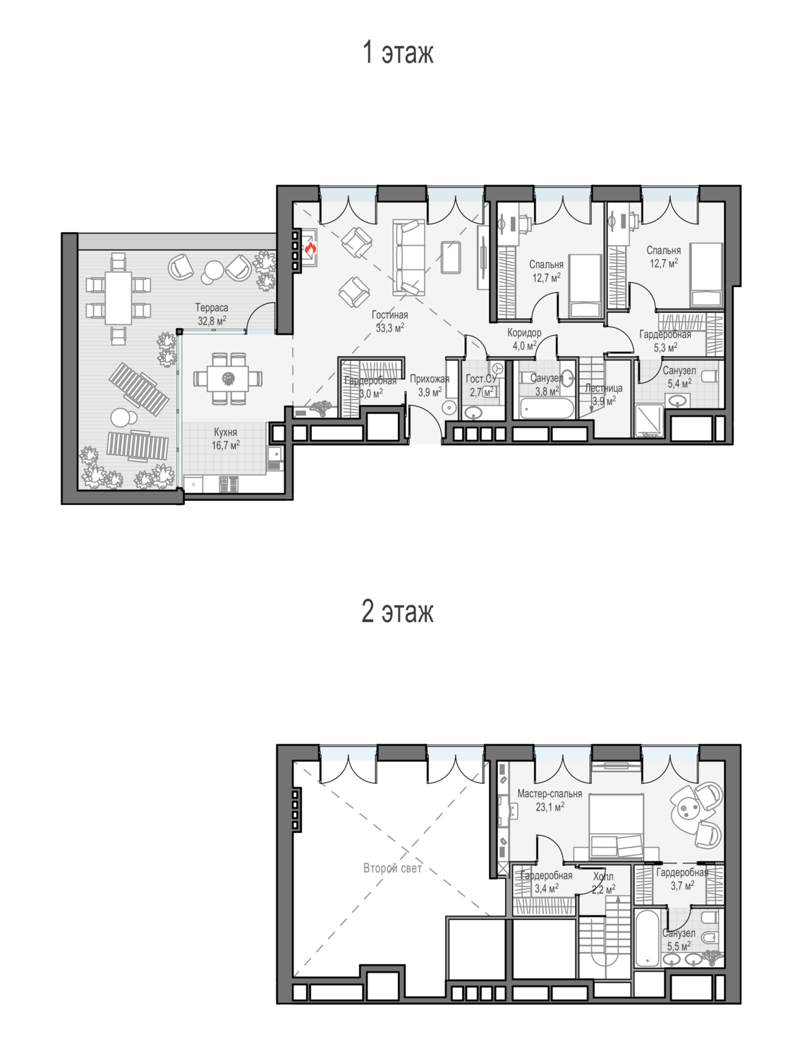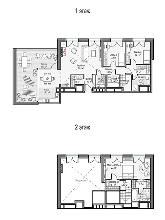 Просторный пентхаус с открытой террасой 32,8 м. Высота потолка - 3,5 м. В кухне-гостиной дровяной камин и два французских балкона. В каждой спальне панорамное остекление и французский балкон. Окна выходят на Восток, открывается впечатляющий вид на зеленый массив парка Дубовая роща и Останкинскую телебашню.