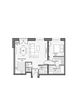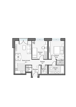 Двуспальная квартира с просторной кухней-гостиной 21,1кв.м. и французским балконом. Вид открывается на парки Останкино, Дубовая роща.