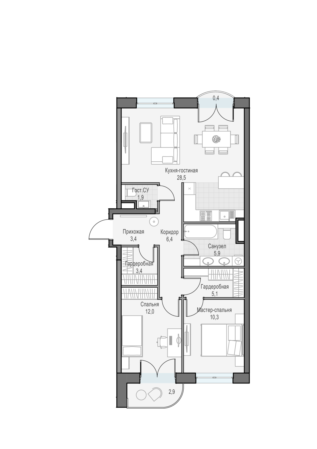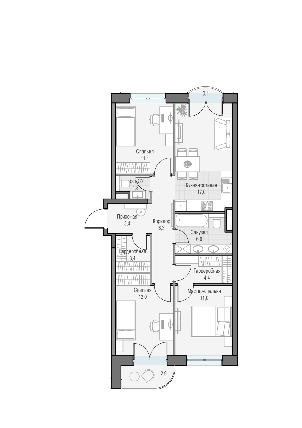 Трёхспальная квартира с кухней-гостиной в сторону Останкинской телебашни. Окна двух спален выходят на запад. В квартире два балкона