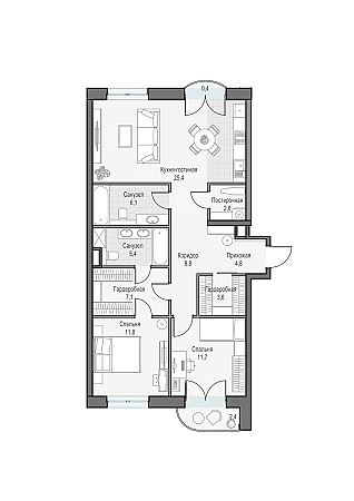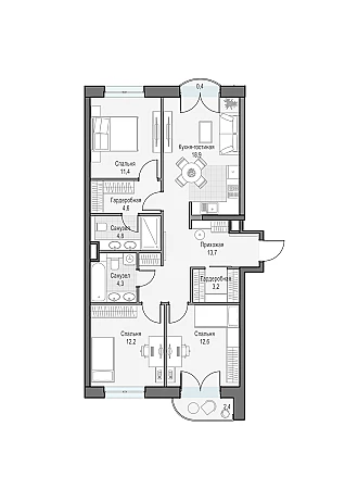 Трёхспальная квартира с балконом из кухни-гостиной на восток. Окна двух спален выходят на Запад, в квартире два балкона