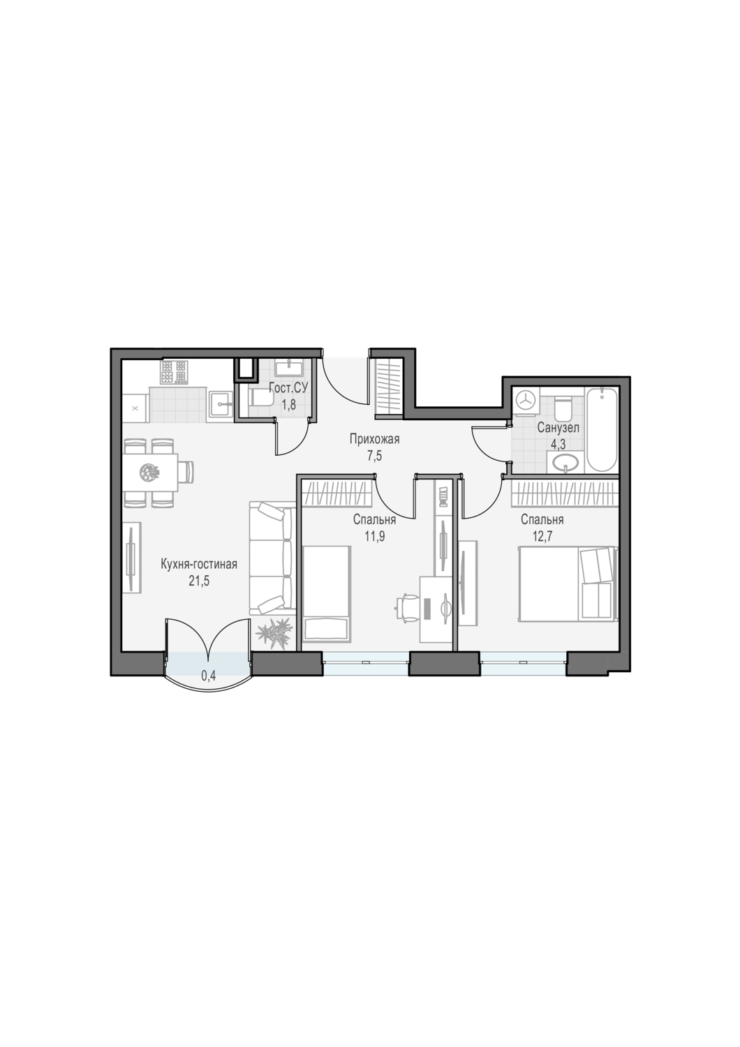 Двуспальная квартира с кухней-гостиной.в квартире есть балкон. две изолированные спальни и два санузла. Окна выходят на Запад.