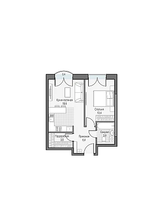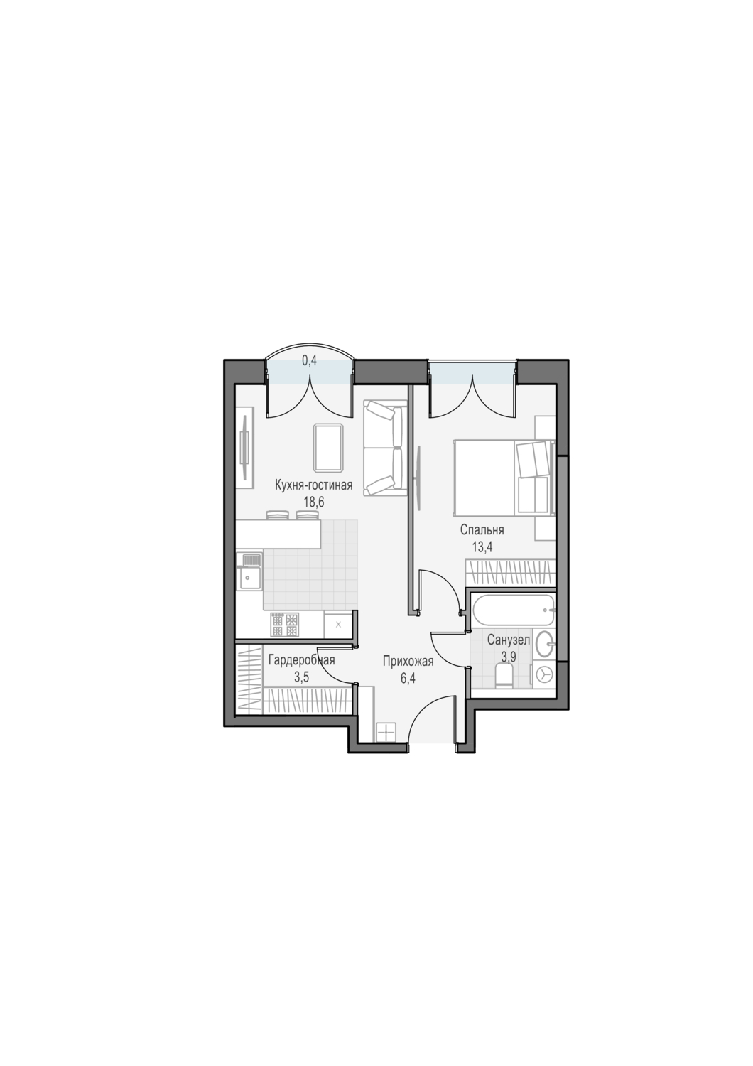 Односпальная квартира с кухней-гостиной и изолированной спальней. В прихожей гардеробная 3,5 кв.м. Окна выходят на восток. В квартире два балкона