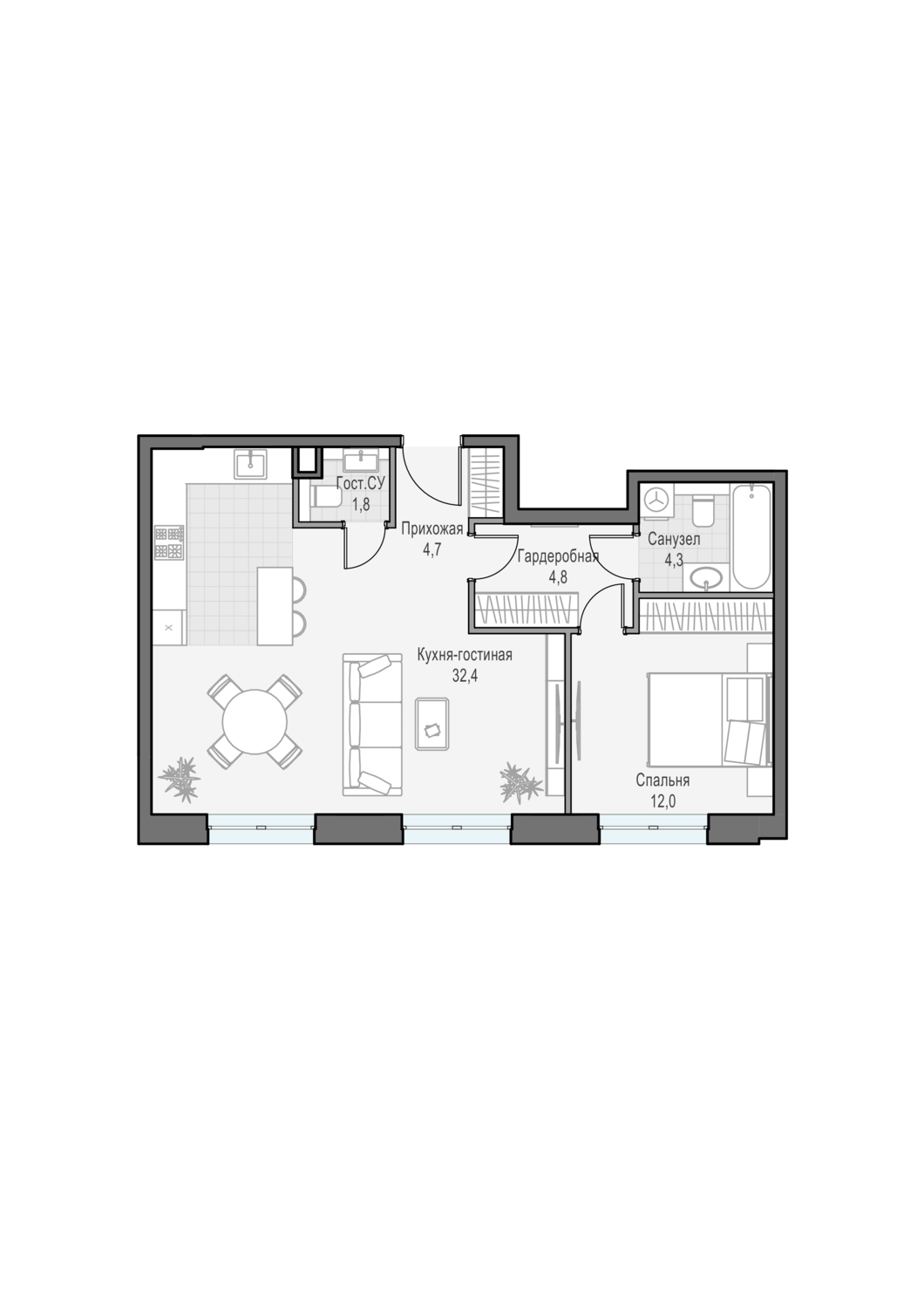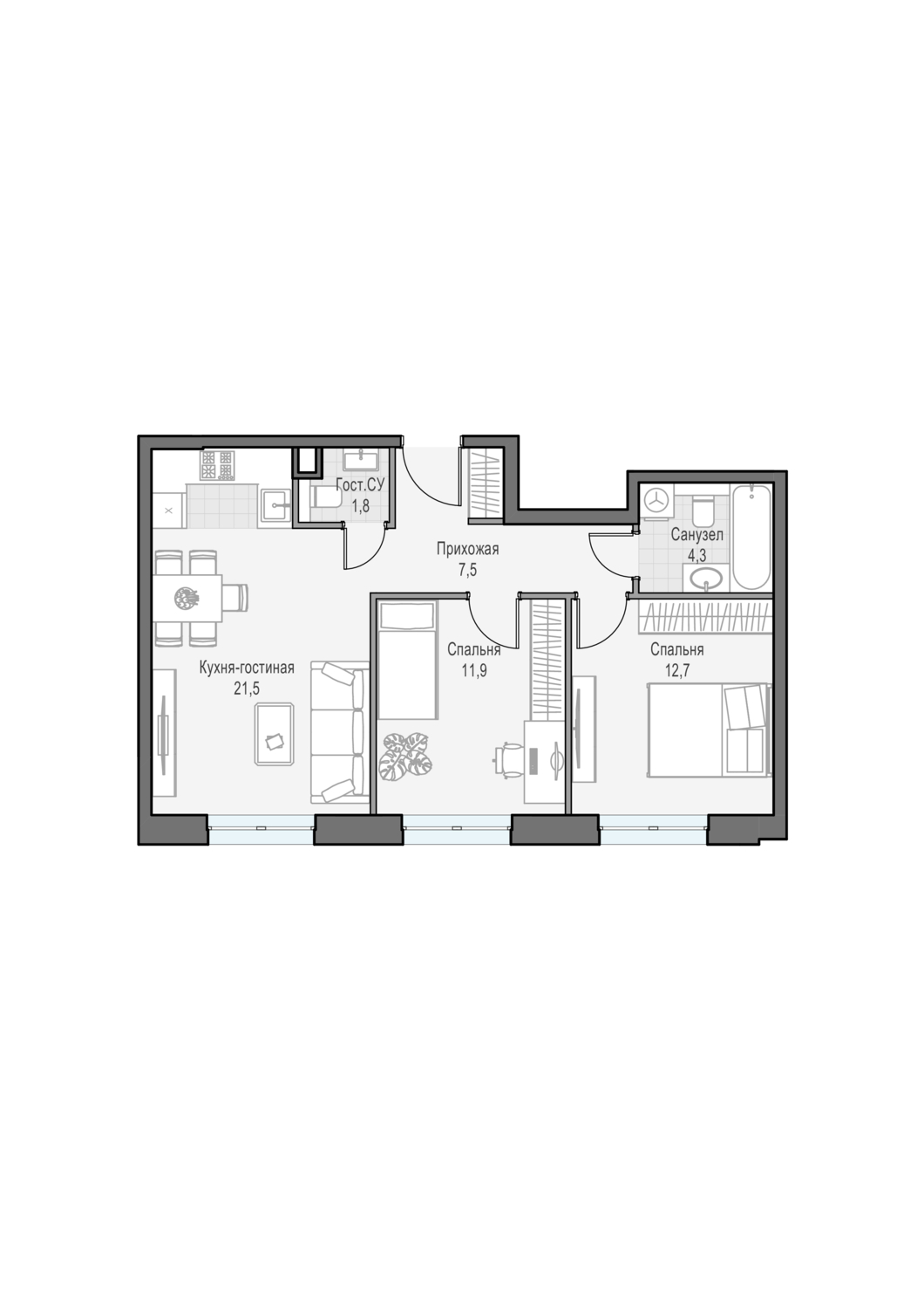 Двуспальная квартира с кухней-гостиной , в квартире две изолированные спальни и два санузла. Окна выходят на ландшафтный двор.