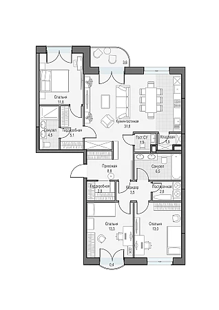 Трёхспальная квартира с кухней-гостиной 31,6 кв.м с видом на Останкино. Окна квартиры выходят на запад и восток. В квартире три балкона.