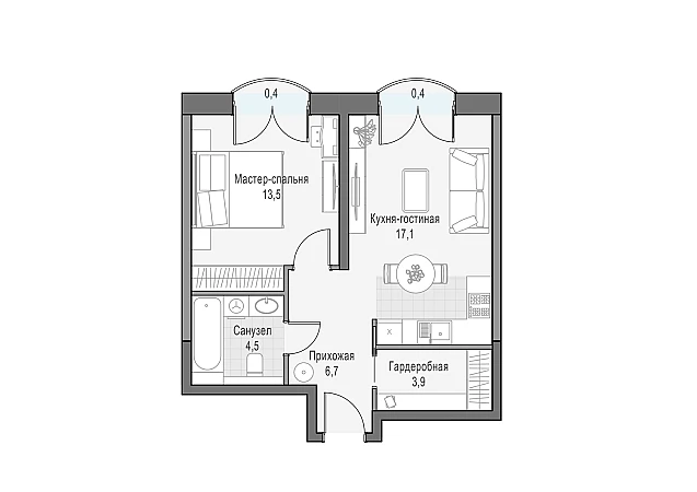 Односпальная квартира с кухней-гостиной и изолированной спальней с видом на восток .В квартире 2 балкона, санузел 4,5 кв.м. и гардеробная 3,9 кв.м.